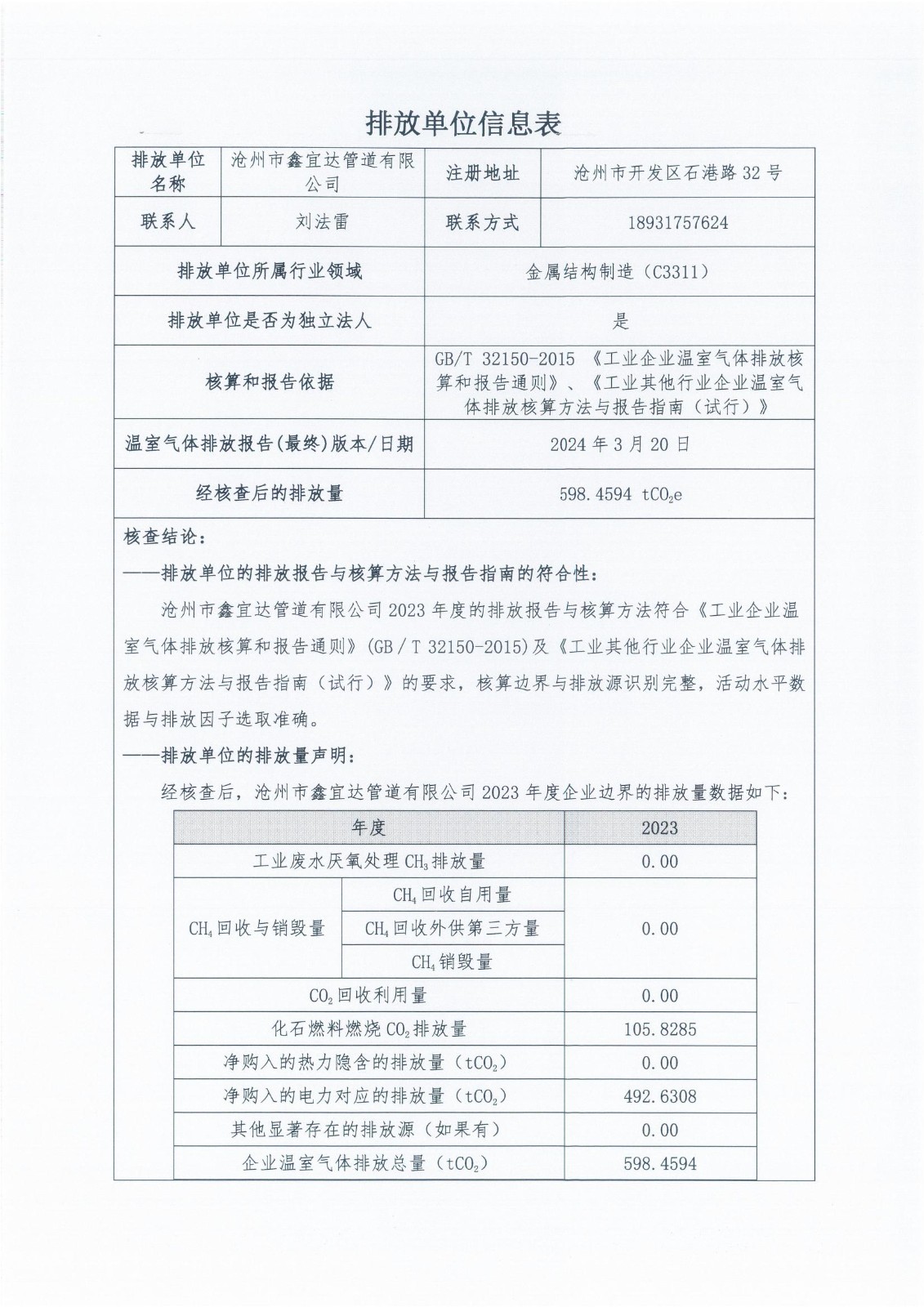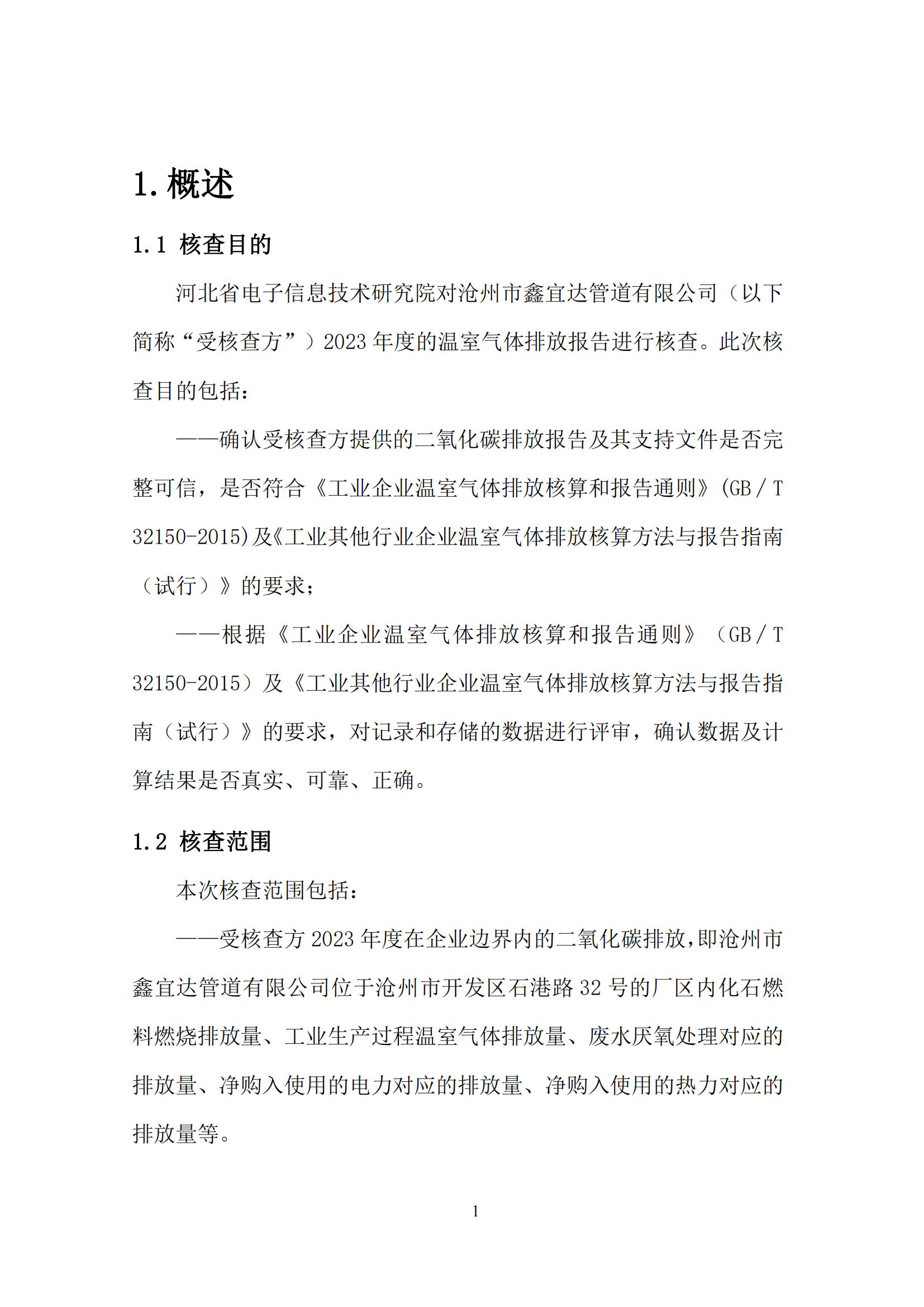 滄州市鑫宜達管道有限公司2023年度溫室氣體排放核查報告